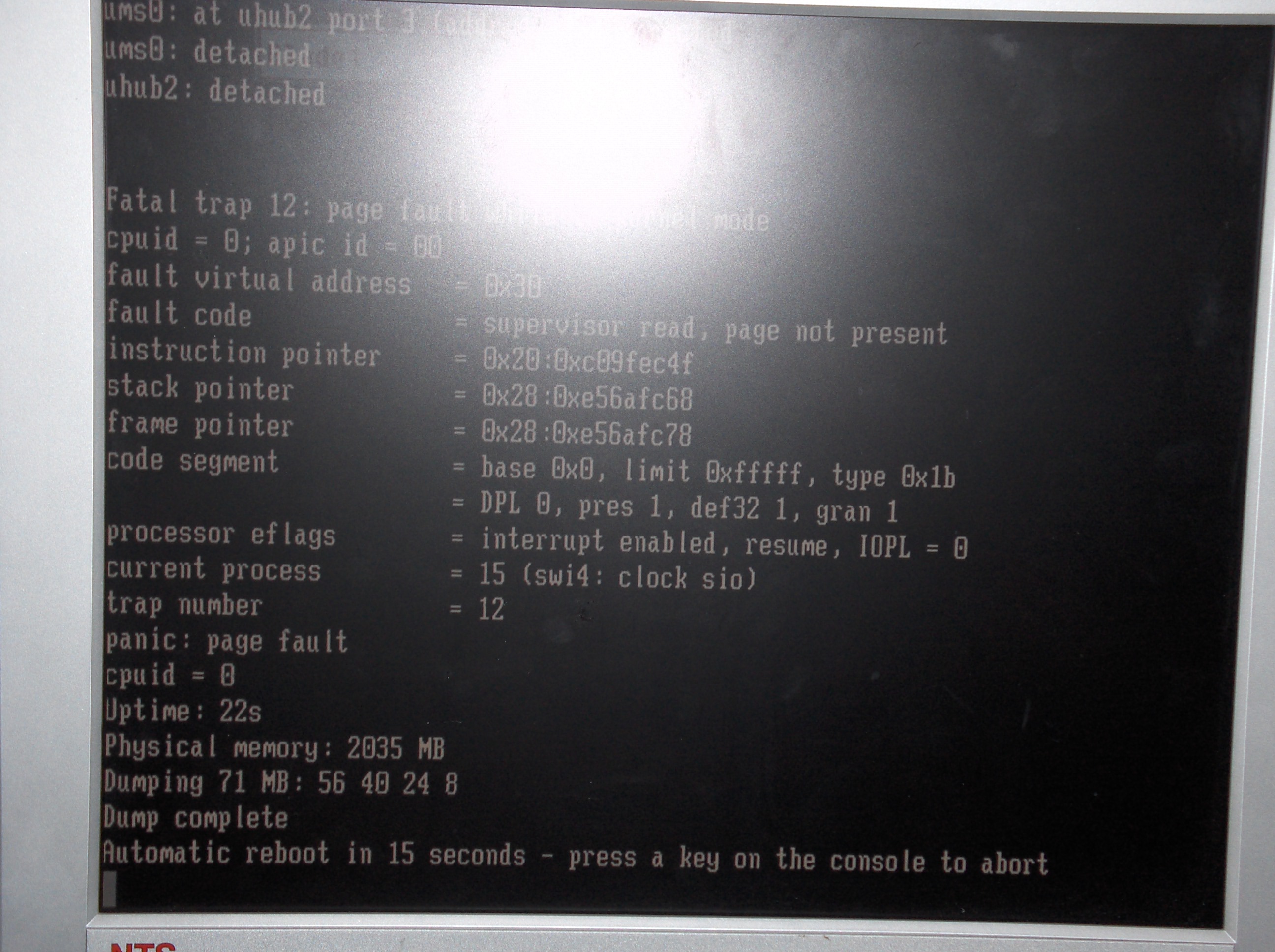 >Number: 122887 >Category: kern >Synopsis: 7.0-RELEASE on IBM HS20 panics immediately when switching VGA port at BladeCenter >Confidential: no >Severity: critical >Priority: high >Responsible: freebsd-bugs >State: open >Quarter: >Keywords: >Date-Required: >Class: sw-bug >Submitter-Id: current-users >Arrival-Date: Fri Apr 18 12:50:01 UTC 2008 >Closed-Date: >Last-Modified: >Originator: Helmut Schneider >Release: 7.0-RELEASE >Organization: >Environment: FreeBSD proxy 7.0-RELEASE-p1 FreeBSD 7.0-RELEASE-p1 #0: Thu Apr 17 10:47:57 CEST 2008 root@BSDHelmut:/usr/obj/usr/src/sys/GENERIC-WITH-QUOTA i386 >Description: A IBM BladeCenter is capable of running multimle blades. Each Blade has a button to relocate console and cdrom. With 7.0-RELEASE switching console from one blade to another FreeBSD panics immediately. Screenshot is available here: http://www.charlieroot.de/images/70_HS20_panic.jpg [root@proxy ~]# dmesg -a Copyright (c) 1992-2008 The FreeBSD Project. Copyright (c) 1979, 1980, 1983, 1986, 1988, 1989, 1991, 1992, 1993, 1994 The Regents of the University of California. All rights reserved. FreeBSD is a registered trademark of The FreeBSD Foundation. FreeBSD 7.0-RELEASE-p1 #0: Thu Apr 17 10:47:57 CEST 2008 root@BSDHelmut:/usr/obj/usr/src/sys/GENERIC-WITH-QUOTA Timecounter "i8254" frequency 1193182 Hz quality 0 CPU: Intel(R) Xeon(TM) CPU 3.20GHz (3200.13-MHz 686-class CPU) Origin = "GenuineIntel" Id = 0xf4a Stepping = 10 Features=0xbfebfbff<FPU,VME,DE,PSE,TSC,MSR,PAE,MCE,CX8,APIC,SEP,MTRR,PGE,MCA,CMOV,PAT,PSE36,CLFLUSH,DTS,ACPI,MMX,FXSR,SSE,SSE2,SS,HTT,TM,PBE> Features2=0x641d<SSE3,RSVD2,MON,DS_CPL,CNXT-ID,CX16,xTPR> AMD Features=0x20000000<LM> AMD Features2=0x1<LAHF> Logical CPUs per core: 2 real memory = 2147155968 (2047 MB) avail memory = 2091606016 (1994 MB) ACPI APIC Table: <IBM SERBLADE> FreeBSD/SMP: Multiprocessor System Detected: 4 CPUs cpu0 (BSP): APIC ID: 0 cpu1 (AP): APIC ID: 1 cpu2 (AP): APIC ID: 6 cpu3 (AP): APIC ID: 7 ioapic3 <Version 2.0> irqs 72-95 on motherboard ioapic2 <Version 2.0> irqs 48-71 on motherboard ioapic1 <Version 2.0> irqs 24-47 on motherboard ioapic0 <Version 2.0> irqs 0-23 on motherboard kbd1 at kbdmux0 ath_hal: 0.9.20.3 (AR5210, AR5211, AR5212, RF5111, RF5112, RF2413, RF5413) hptrr: HPT RocketRAID controller driver v1.1 (Apr 17 2008 10:47:26) acpi0: <IBM SERBLADE> on motherboard acpi0: [ITHREAD] acpi0: Power Button (fixed) Timecounter "ACPI-fast" frequency 3579545 Hz quality 1000 acpi_timer0: <24-bit timer at 3.579545MHz> port 0x588-0x58b on acpi0 cpu0: <ACPI CPU> on acpi0 p4tcc0: <CPU Frequency Thermal Control> on cpu0 cpu1: <ACPI CPU> on acpi0 p4tcc1: <CPU Frequency Thermal Control> on cpu1 cpu2: <ACPI CPU> on acpi0 p4tcc2: <CPU Frequency Thermal Control> on cpu2 cpu3: <ACPI CPU> on acpi0 p4tcc3: <CPU Frequency Thermal Control> on cpu3 pcib0: <ACPI Host-PCI bridge> on acpi0 pci0: <ACPI PCI bus> on pcib0 pci0: <unknown> at device 0.1 (no driver attached) pcib1: <ACPI PCI-PCI bridge> at device 3.0 on pci0 pci4: <ACPI PCI bus> on pcib1 pcib2: <ACPI PCI-PCI bridge> at device 0.0 on pci4 pci6: <ACPI PCI bus> on pcib2 pcib3: <ACPI PCI-PCI bridge> at device 0.2 on pci4 pci5: <ACPI PCI bus> on pcib3 bge0: <Broadcom NetXtreme Gigabit Ethernet Controller, ASIC rev. 0x2100> mem 0xdcff0000-0xdcffffff irq 77 at device 1.0 on pci5 bge0: Ethernet address: 00:14:5e:bd:7a:60 bge0: [ITHREAD] bge1: <Broadcom NetXtreme Gigabit Ethernet Controller, ASIC rev. 0x2100> mem 0xdcfe0000-0xdcfeffff irq 78 at device 1.1 on pci5 bge1: Ethernet address: 00:14:5e:bd:7a:61 bge1: [ITHREAD] pci0: <base peripheral> at device 8.0 (no driver attached) pcib4: <ACPI PCI-PCI bridge> at device 28.0 on pci0 pci2: <ACPI PCI bus> on pcib4 mpt0: <LSILogic 1030 Ultra4 Adapter> port 0x4000-0x40ff mem 0xdeff0000-0xdeffffff,0xdefe0000-0xdefeffff irq 24 at device 1.0 on pci2 mpt0: [ITHREAD] mpt0: MPI Version=1.2.15.0 mpt0: Capabilities: ( RAID-1E RAID-1 SAFTE ) mpt0: 1 Active Volume (1 Max) mpt0: 2 Hidden Drive Members (6 Max) uhci0: <UHCI (generic) USB controller> port 0x2200-0x221f irq 16 at device 29.0 on pci0 uhci0: [GIANT-LOCKED] uhci0: [ITHREAD] usb0: <UHCI (generic) USB controller> on uhci0 usb0: USB revision 1.0 uhub0: <Intel UHCI root hub, class 9/0, rev 1.00/1.00, addr 1> on usb0 uhub0: 2 ports with 2 removable, self powered uhci1: <UHCI (generic) USB controller> port 0x2600-0x261f irq 19 at device 29.1 on pci0 uhci1: [GIANT-LOCKED] uhci1: [ITHREAD] usb1: <UHCI (generic) USB controller> on uhci1 usb1: USB revision 1.0 uhub1: <Intel UHCI root hub, class 9/0, rev 1.00/1.00, addr 1> on usb1 uhub1: 2 ports with 2 removable, self powered pci0: <base peripheral> at device 29.4 (no driver attached) pcib5: <ACPI PCI-PCI bridge> at device 30.0 on pci0 pci1: <ACPI PCI bus> on pcib5 vgapci0: <VGA-compatible display> port 0x3000-0x30ff mem 0xf0000000-0xf7ffffff,0xf8000000-0xf800ffff irq 20 at device 1.0 on pci1 isab0: <PCI-ISA bridge> at device 31.0 on pci0 isa0: <ISA bus> on isab0 atapci0: <Intel 6300ESB UDMA100 controller> port 0x1f0-0x1f7,0x3f6,0x170-0x177,0x376 at device 31.1 on pci0 ata0: <ATA channel 0> on atapci0 ata0: [ITHREAD] ata1: <ATA channel 1> on atapci0 ata1: [ITHREAD] pci0: <serial bus, SMBus> at device 31.3 (no driver attached) sio0: <16550A-compatible COM port> port 0x3f8-0x3ff irq 4 flags 0x10 on acpi0 sio0: type 16550A sio0: [FILTER] pmtimer0 on isa0 orm0: <ISA Option ROM> at iomem 0xc0000-0xc8fff pnpid ORM0000 on isa0 atkbdc0: <Keyboard controller (i8042)> at port 0x60,0x64 on isa0 atkbd0: <AT Keyboard> irq 1 on atkbdc0 kbd0 at atkbd0 atkbd0: [GIANT-LOCKED] atkbd0: [ITHREAD] psm0: unable to set the command byte. ppc0: parallel port not found. sc0: <System console> at flags 0x100 on isa0 sc0: VGA <16 virtual consoles, flags=0x300> sio1: configured irq 3 not in bitmap of probed irqs 0 sio1: port may not be enabled vga0: <Generic ISA VGA> at port 0x3c0-0x3df iomem 0xa0000-0xbffff on isa0 uhub2: <Cypress Semiconductor 4 Port Hub, class 9/0, rev 1.10/0.01, addr 2> on uhub1 uhub2: 4 ports with