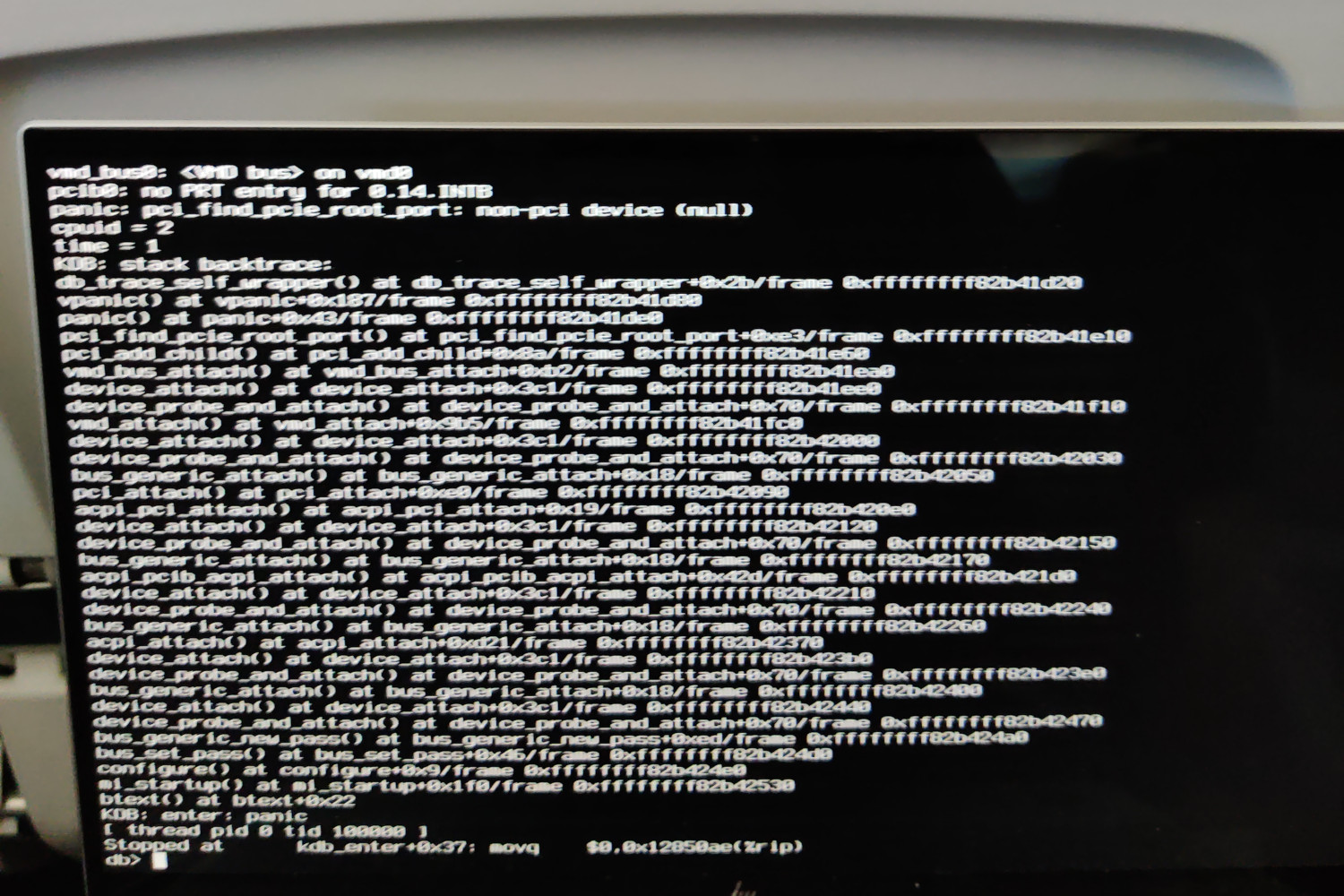 Hi freebsd-current@ (CC'd ambrisko@ and imp@), Right now, with a laptop (HP Spectre x360 13t-aw200) which needs the vmd(8) driver for NVMe, I am getting kernel panics upon bootup with a recent kernel. Here's a screenshot of the panic: https://bz-attachments.freebsd.org/attachment.cgi?id=226185 (blurry since I took it on the plane) The bug is here: https://bugs.freebsd.org/bugzilla/show_bug.cgi?id=256915 If I use an older kernel (which I'm doing for now), it works fine. If I use the memstick USB, it crashes with the same panic. I initially thought it was commit ddfc9c4c59e2ea4871100d8c076adffe3af8ff21, but even when I reverted to one before the said commit, it still panicked with the same error. I don't see any changes to vmd(8), so changes to some other PC subsystem (PCI/ACPI/x86/NVMe/etc.) after commit ab6d05336caaa10ae315f81534851e3764a8660c (current kernel commit) must have caused the error. -Neel (nc@)home | help