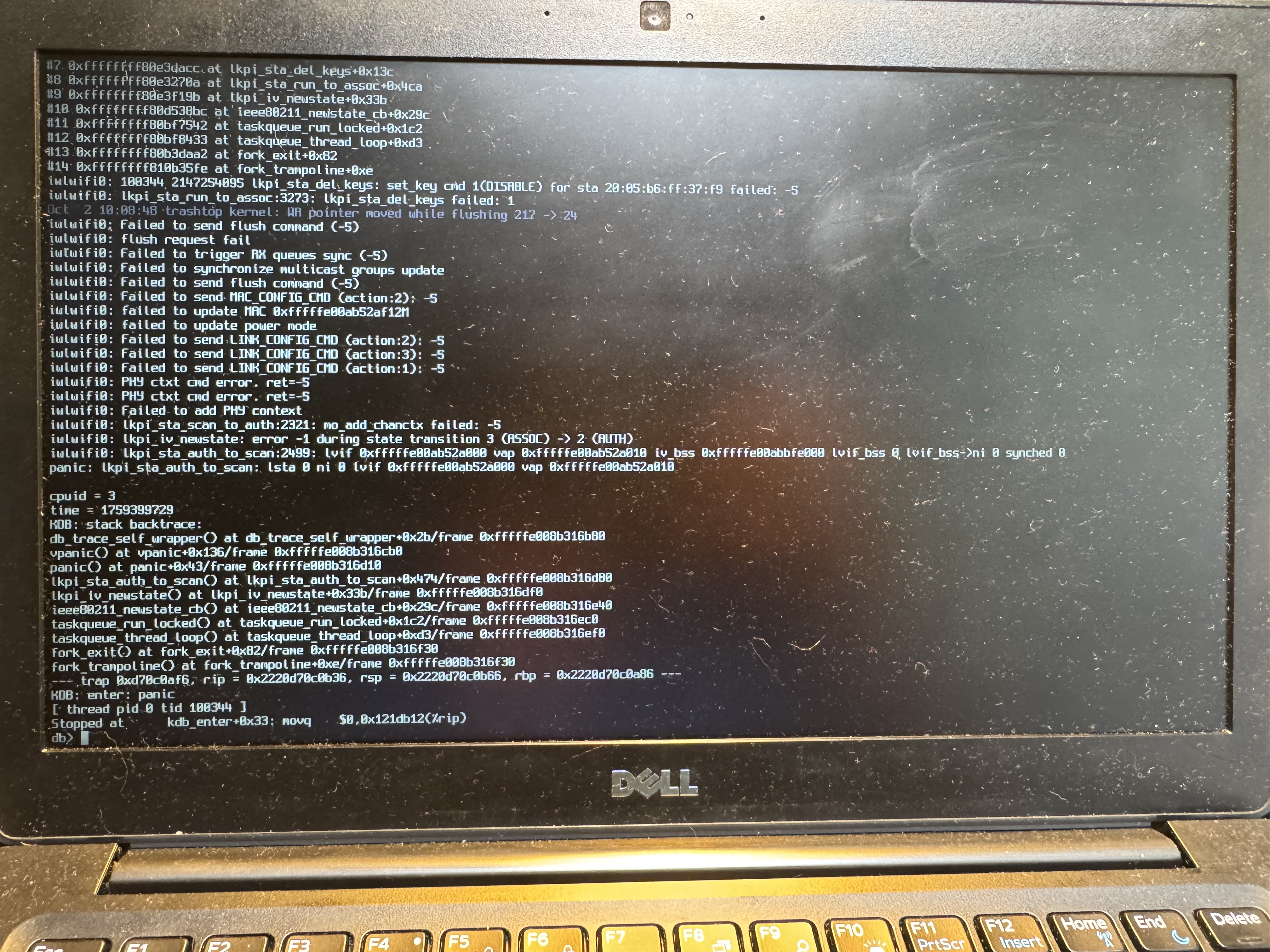 https://bugs.freebsd.org/bugzilla/show_bug.cgi?id=290045 Bug ID: 290045 Summary: iwlwifi panics when asked to reassociate Product: Base System Version: CURRENT Hardware: Any OS: Any Status: New Severity: Affects Some People Priority: --- Component: kern Assignee: bugs@FreeBSD.org Reporter: thj@FreeBSD.org iwlwifi panics when a reassociate is issued via wpa_cli a photo of the panic is here: https://adventurist.me/public/IMG_7585.jpeg -- You are receiving this mail because: You are the assignee for the bug.help